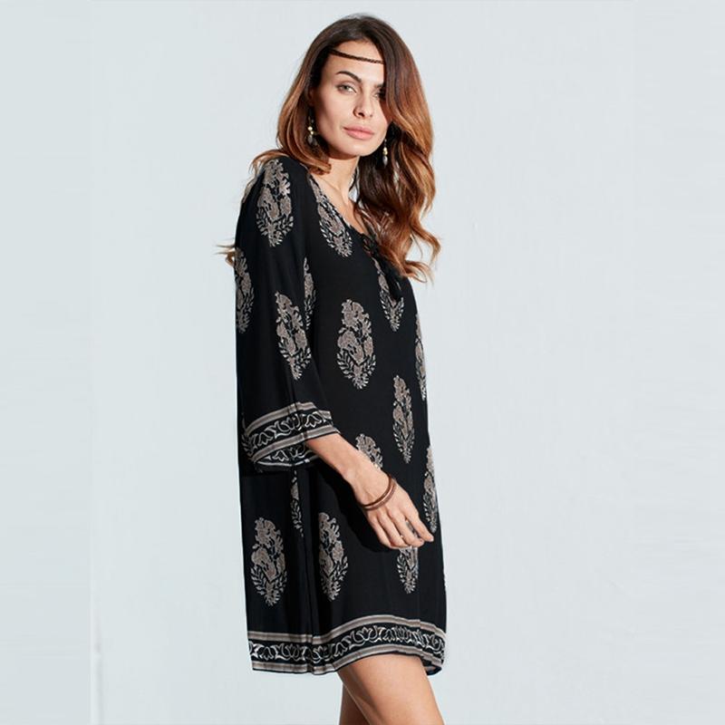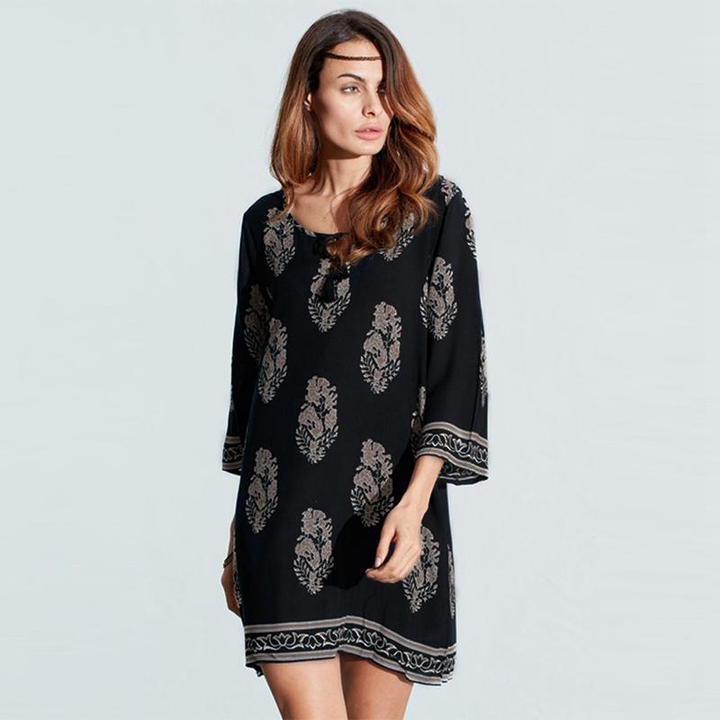 ZANZEA Women Vintage Floral Print Dress Autumn Casual Loose Mini Vestidos Lace Up 3/4 Sleeve Beach Dresses - intl
