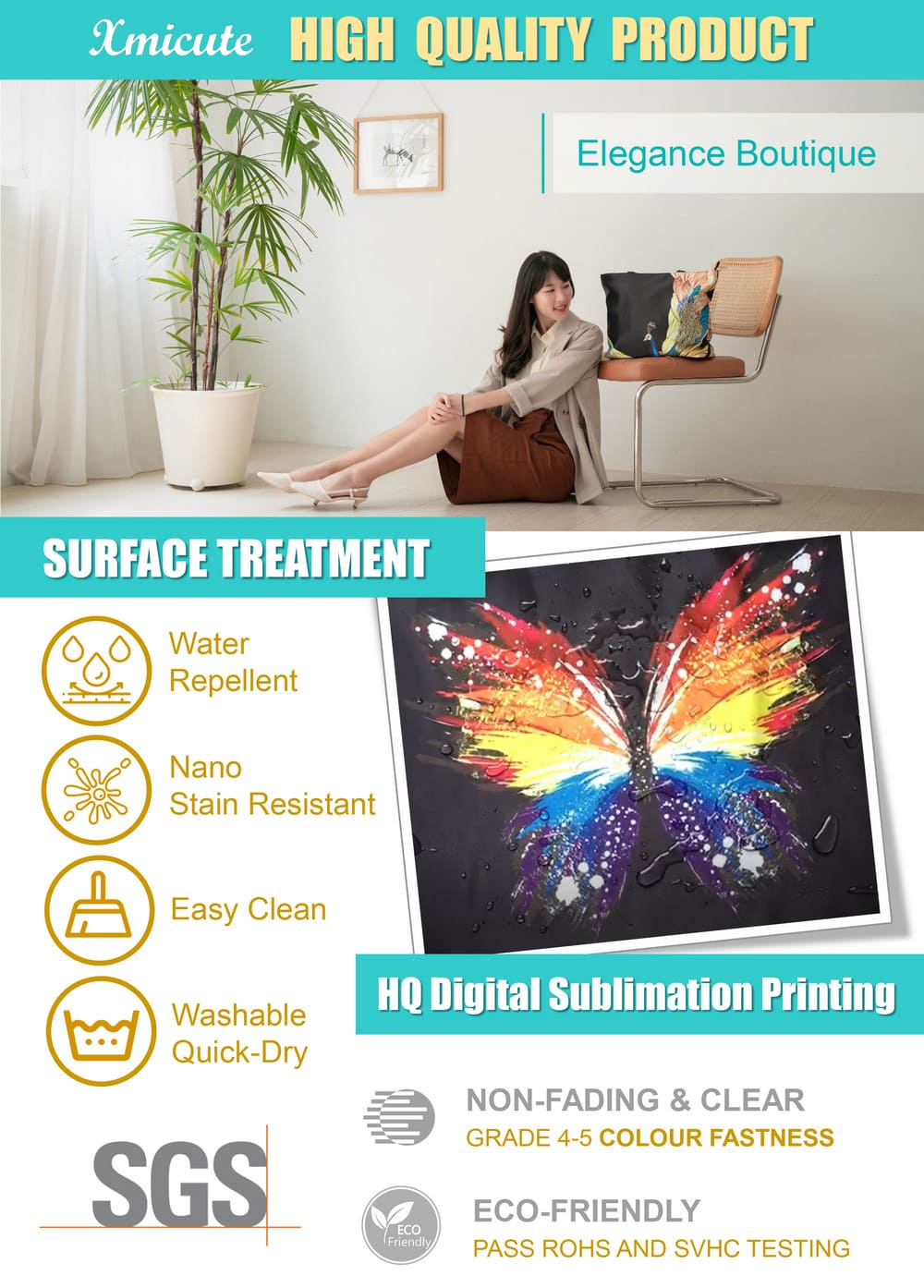 Durable, Water Repellent, Non-fading, Pass SGS, ROHS and SVHC Testing, Washable, Quick-Dry, Easy Clean, Quick 3D Mockup Sample,