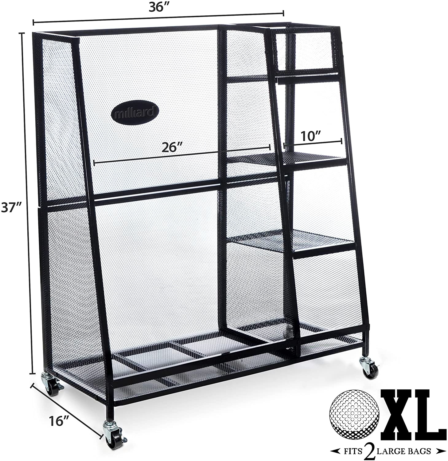 * Extra Roomy - main compartment has been upgraded to 26 inches long to fit 2 standard or large size golf bags! 3 open shelves for your medium sized gear, and 1 closed in shelf for your small loose items.