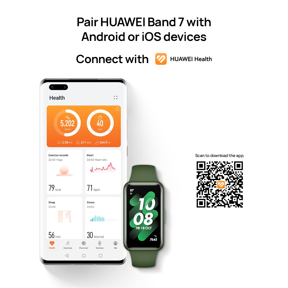 • HUAWEI Band 7 isn’t just a health and fitness tracker, more is designed for body, mind, and soul. Ultra-Thin Design and Slim bezel-less screen outline the content onscreen, drawing attention to the services and features you love. Up to 14 days battery life to handle your long business trips and vacations. Health and Fitness Tru Series Technologies offers you with all-round care, SpO2 Blood Oxygen & Heart Rate monitor, Sleep Tracking, Stress Monitoring as well as 96 Workout Modes. HUAWEI Band 7 providing direct access to the most essential phone features, like incoming calls and messages, weather forecasts, and music controls, even to take an instant snapshot on your phone, or send out quick replies to messages!
