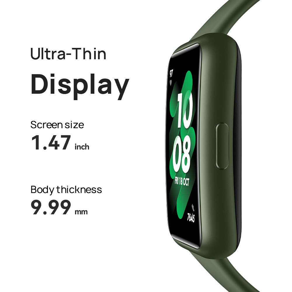 【Slim bezel-less screen】: HUAWEI Band 7 is super light weight about 16g* with a 1.47" screen size which wraps around the wrist with ease. Ultra-narrow bezels outline the content onscreen, drawing attention to the services and features you love. The band's stunning AMOLED FullView Display seems to float on air, sitting atop a highly-breathable strap.