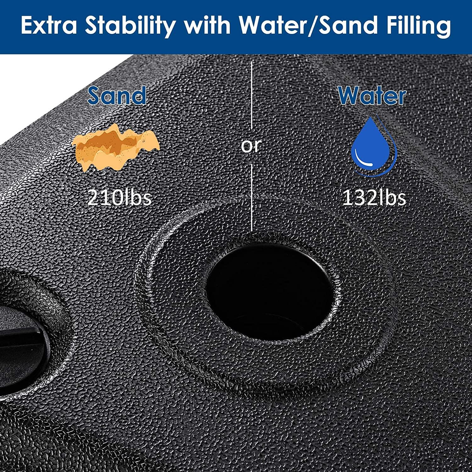 1、Durable Design: The parasol stand features the flexibility, antifreeze and low temperature resistance.2、Low Temperature Resistance: The parasol stand features slow oxidation rate, low temperature resistance, stable physical properties.3、Abrasion Resistance: The parasol stand features enhanced water filled hole, excellent plastic material, not easy to abrase.4、Smooth Design: The parasol stand features the smooth and tearing-resistant excellent materials, and it is made of excellent materials, so the hard objects are not easy to damage it.5、High Temperature Resistance: The parasol stand features the high temperature resistance and long-term sun resistance to be not easy to damage, and it features the anti-oxidation materials, long service life.
