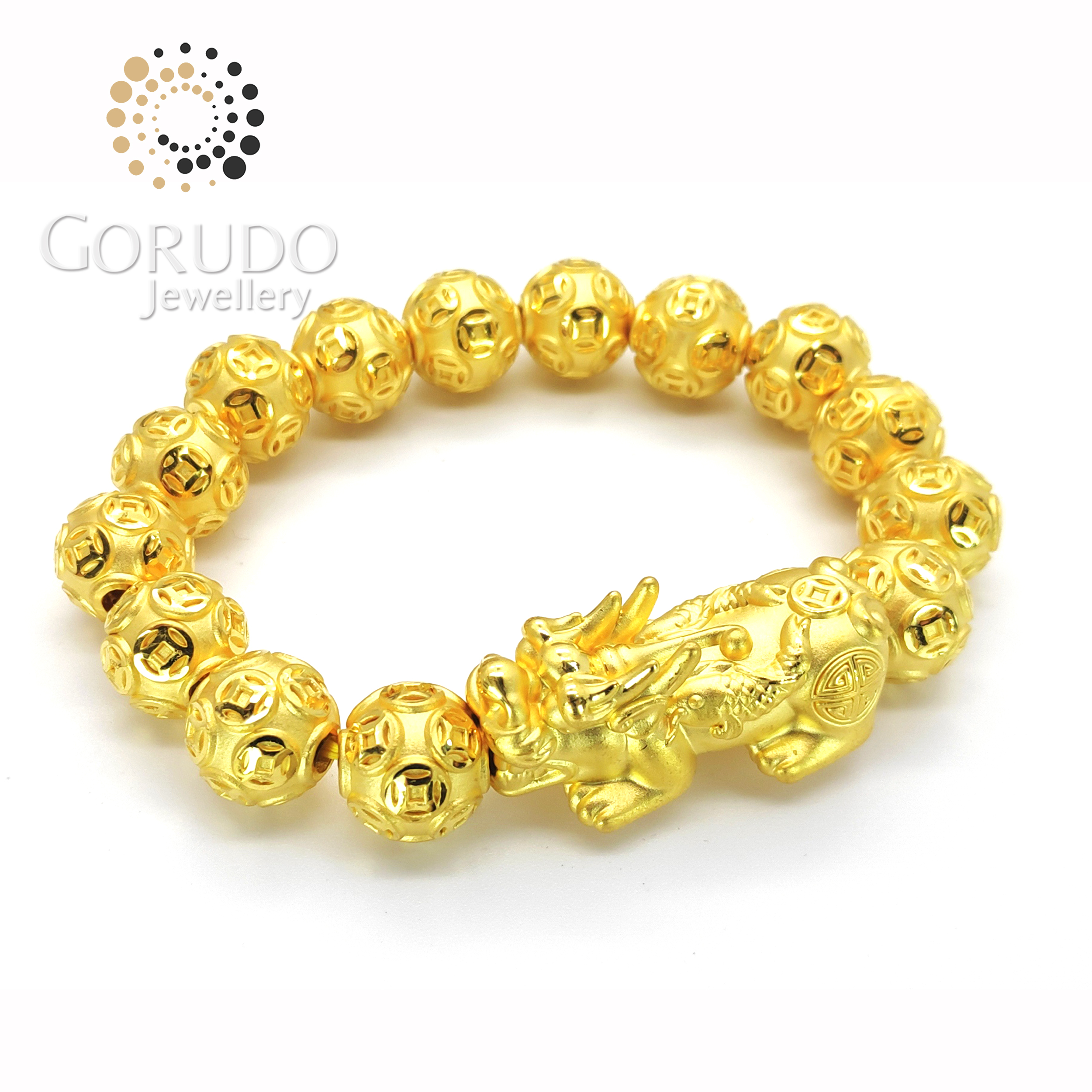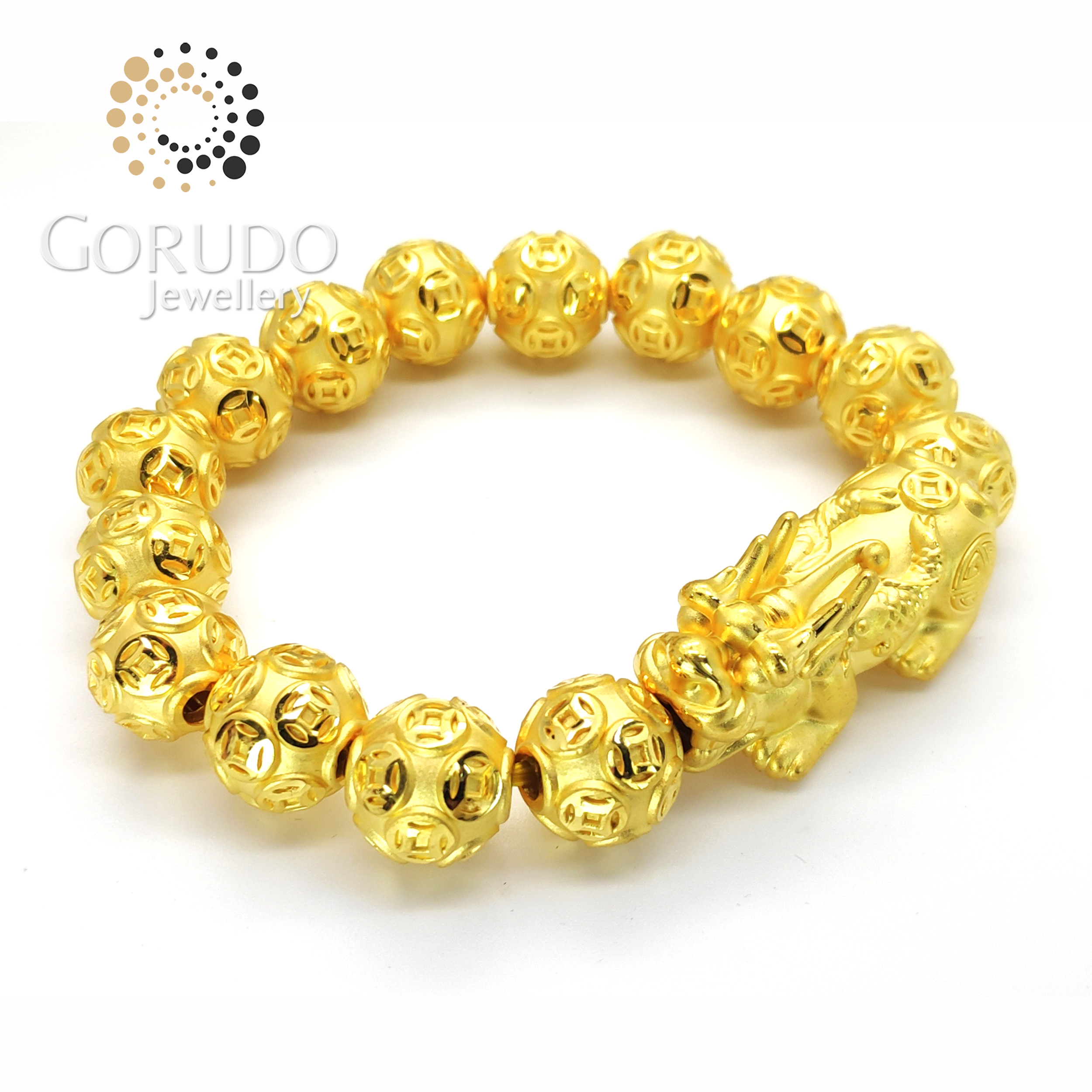1 x Gorudo Jewellery Pure Gold 999 双鱼 Pixiu + 15 Auspicious Gold Coin Ball Charm Bracelet