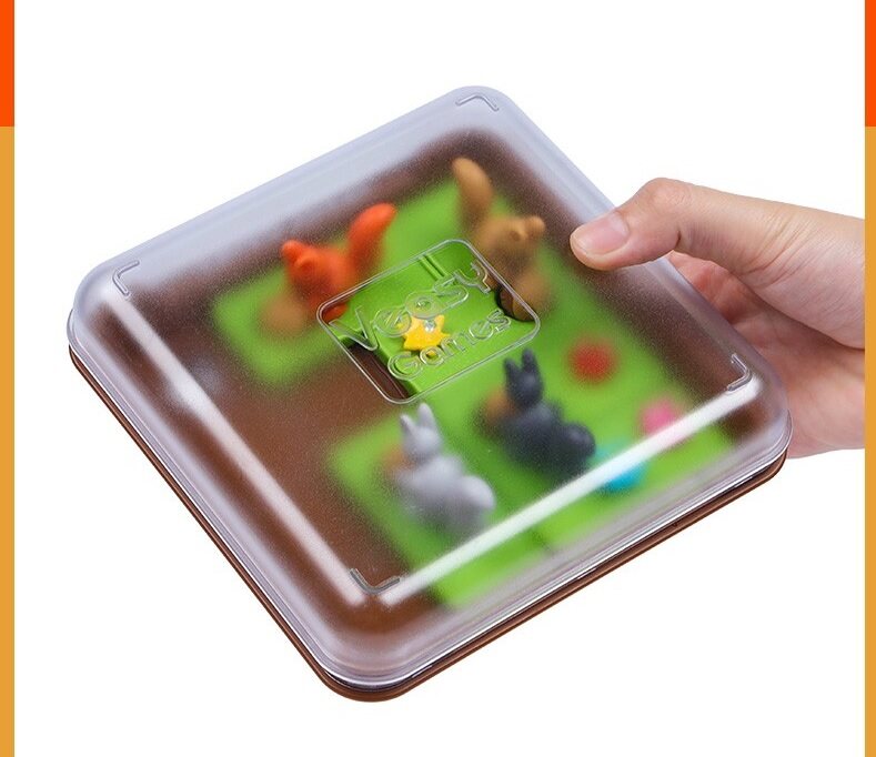 Squirrels Go Nuts! is unique logic game in that it offers the fun of actually dropping the acorns into holes. Earlier challenges are easier, but later challenges require 50+ moves to solve! But fear not: one of the neat things about Squirrels Go Nuts! is that players can re-trace their steps in the middle of a challenge without having to start over, simply pick up the board, replace the acorn, and continue!