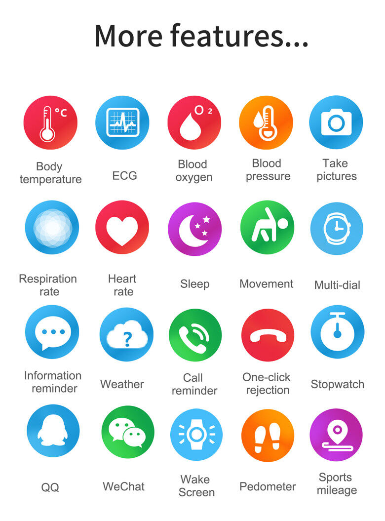 Main Feature1.Temperature monitoring, blood oxygen monitoring, respiratory rate. 2.ECG + PPG combined with ECG AI medical diagnosis. 3.Exercise function: step count / calories / distance, 4.Multi Sport mode 5.Heart rate monitoring, blood pressure monitoring and other health functions 6.Remote care function 7.Environmental friendly TPU / metal strap, hand to hand Wearable 8.Wearable hardware + smart app + big data cloud service 9.Wear it with you and control, display and record data through app. 10.Super long endurance standby.
