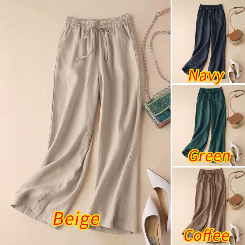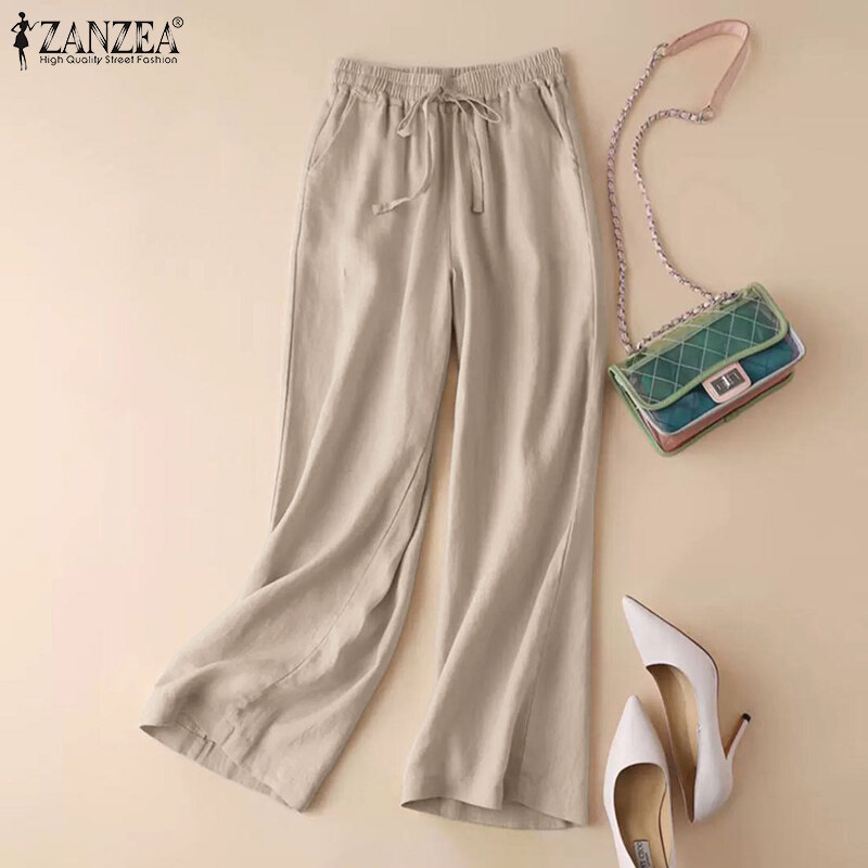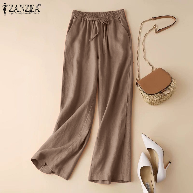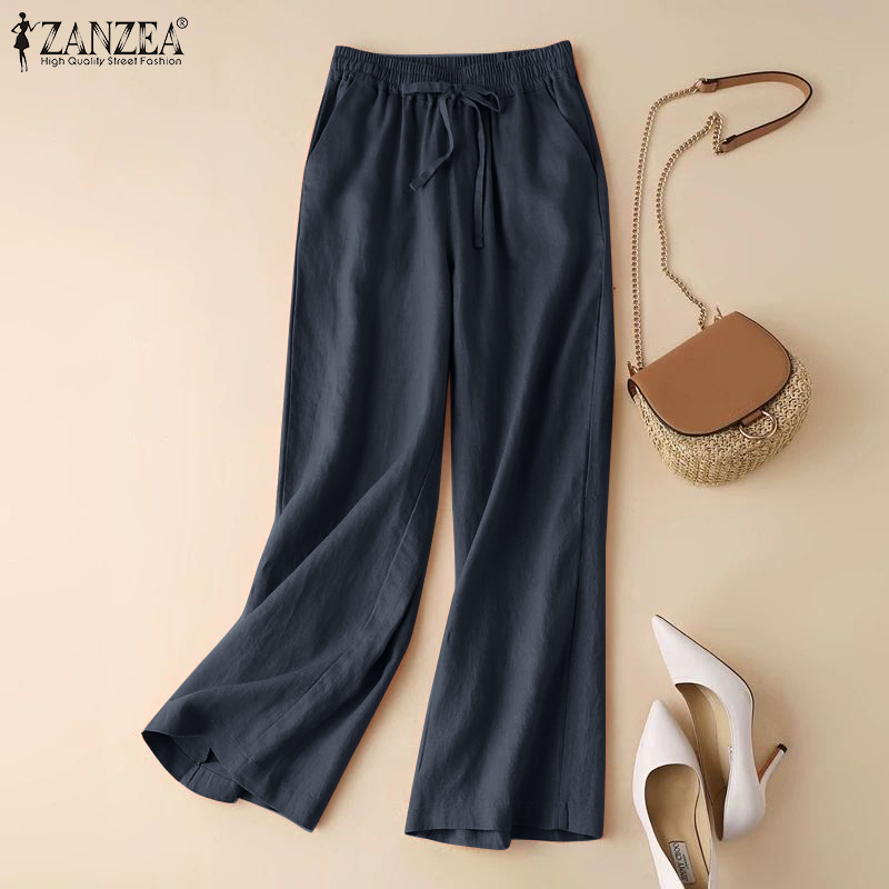 ZANZEA Women Cotton Solid Color Trousers Casual Elastic Waist Baggy Long Pants