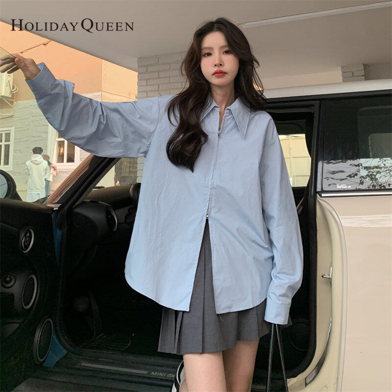 HolidayQueen Korean Loose Top Autumn New Design Niche Double Zipper Solid Color Long-sleeved Shirt Women Free Shipping HQ1826