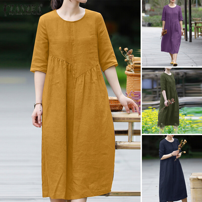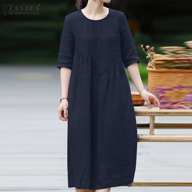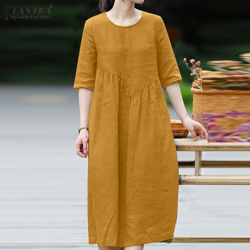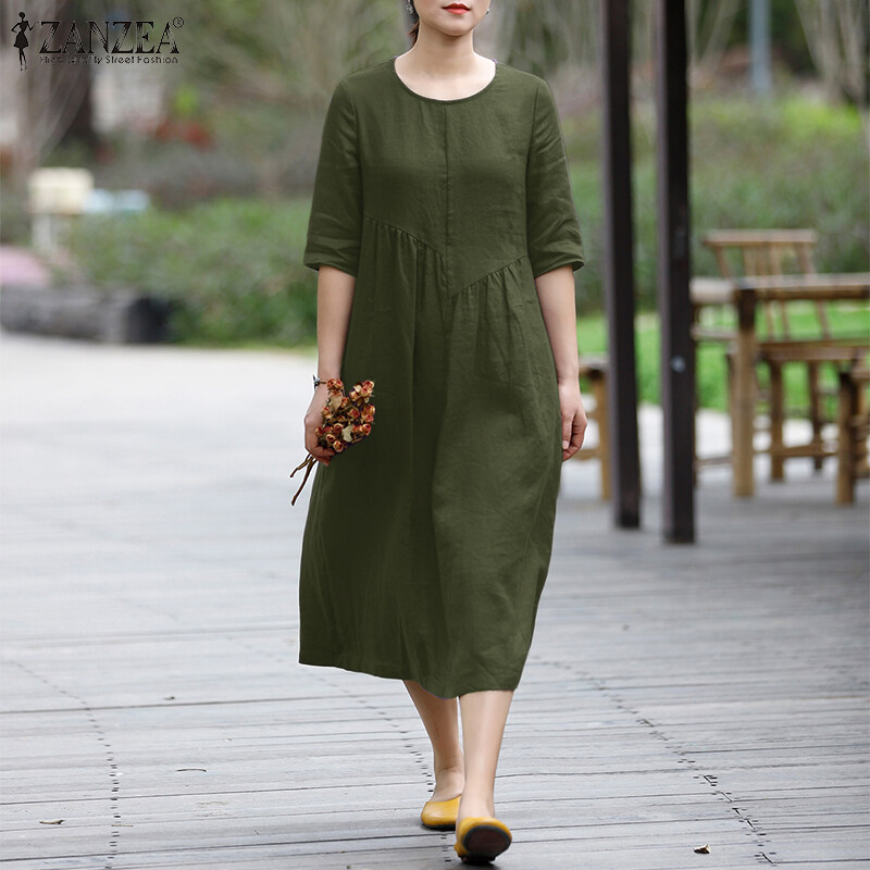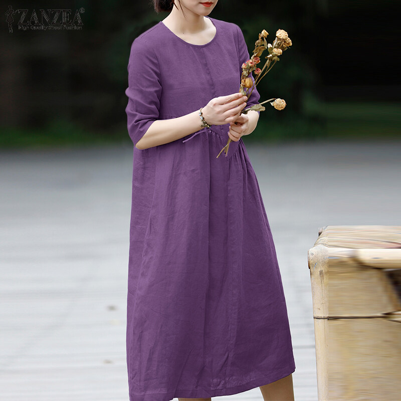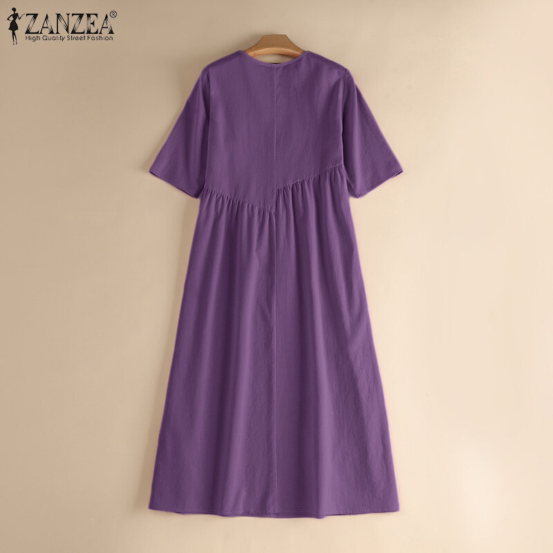 ZANZEA Women Leisure Cotton Pleated Short Sleeve Midi Dresses Bohemian Round Neck Sundress #8