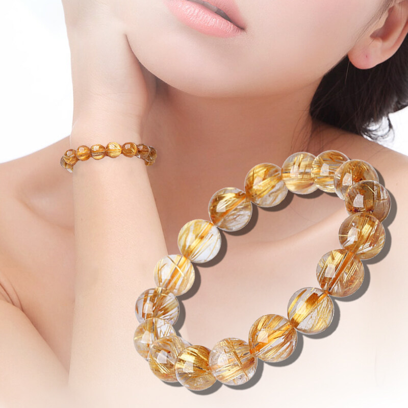 Natural Brazilian Titanium Gold Crystal Bead Bracelet Yellow Crystal Bead Quartz Healing Collection Grade Hair Crystal Single Circle Men's and Women's Lucky Bead Jewelry Bracelet Male Lucky Bracelet